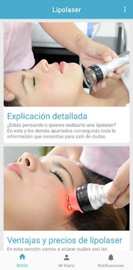 Have you thought or are you a person who is interested in the lipolaser technique? In this application fully translated into Spanish we are going to show you all the information about this new technique. The information displayed in this app is completely free. The lipolaser procedure is perfectly valid for men and women. The results in all areas of the body are very effective and the procedure is non-invasive. You can download this application and solve all your doubts about this type of procedure.