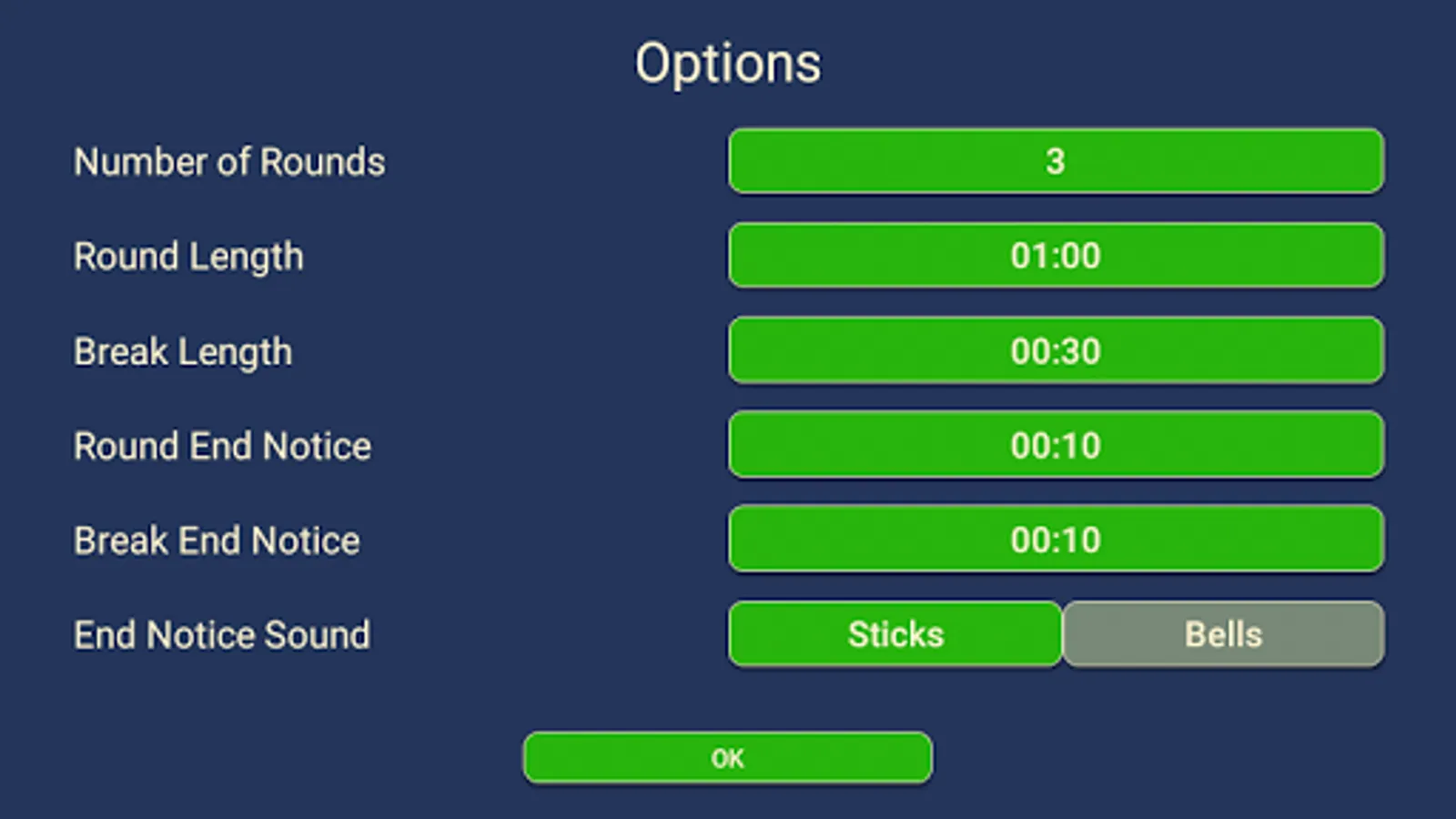 - Red color for breaks, Green color for Rounds, Orange color for Round for last 15 seconds