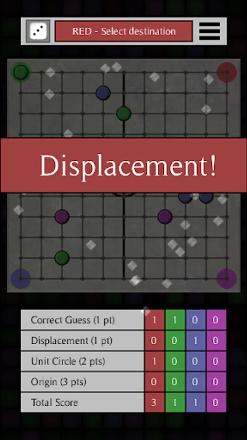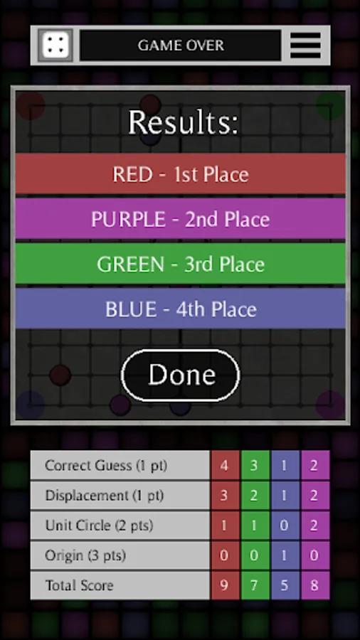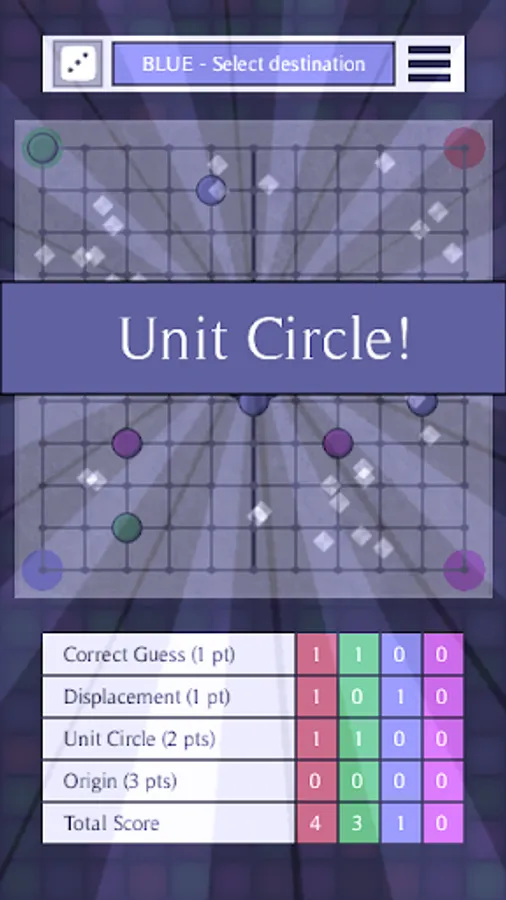 Red, green, blue, and purple race to acquire the most points while capturing the unit circle on an x-y grid.
