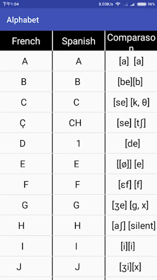 The recommendation of bilingual study between French and Spanish for this app, It is because the first page of the app which the alphabet is indicated in three column, the first column is the list of the French alphabet and the second column shows the Spanish alphabet which the third column where they are listed line by line and in parallel where the pronunciation are shown are compared with each other. It is clearly shown the differences and the similarity of the two languages so learning is more interested. The purpose of publishing this app is learning the languages in pair is to increase the interest of learning them and learning in an enjoyable way.