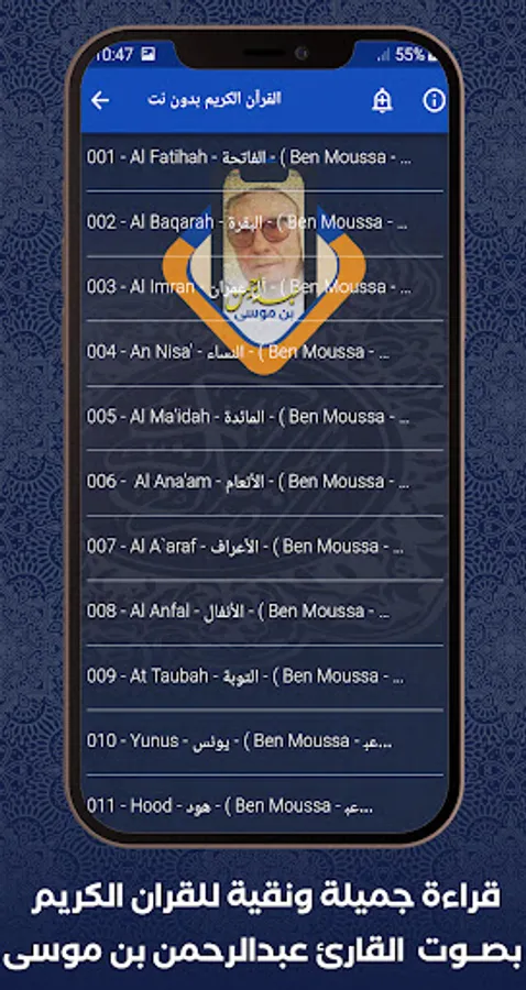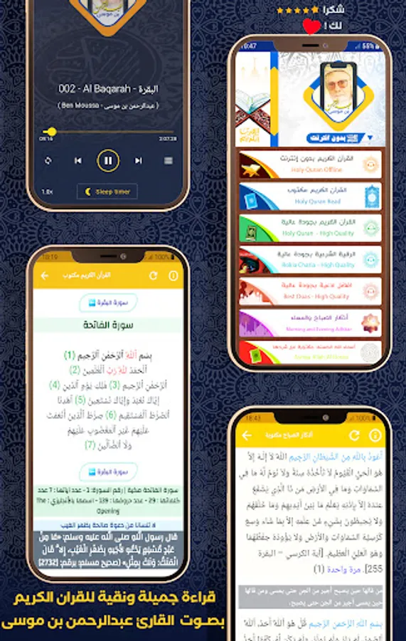⯈ You can use this application with ease and also read and listen to the surahs of the Noble Qur’an, enjoying the voice of the reciter Abderrahman Benmoussa, who is one of the most famous reciters