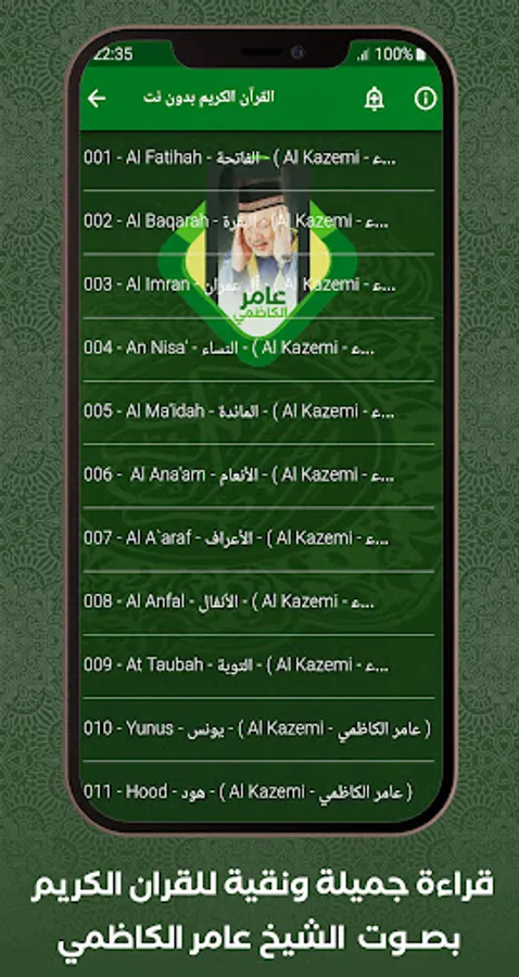 ⯈ This new application for the Holy Quran without the Internet provides access to the collection of exclusive Quran recitations, supplications, recitation morning and evening remembrances, with the voice of Sheikh Amer Al-Kazemi.