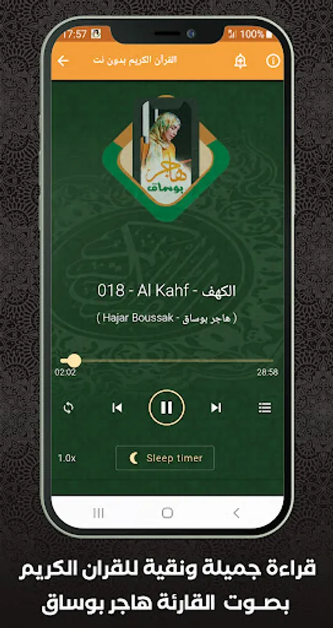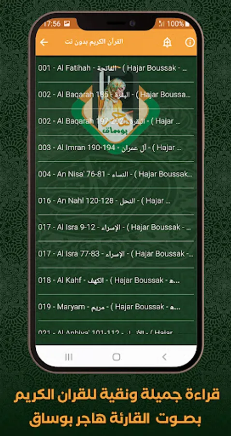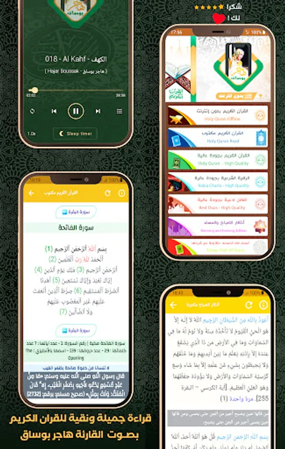 ⯈ This new application for the Holy Quran without the Internet provides access to the collection of exclusive Quran recitations, supplications, recitation morning and evening remembrances, with the voice of Qareah Hajar Boussak.
