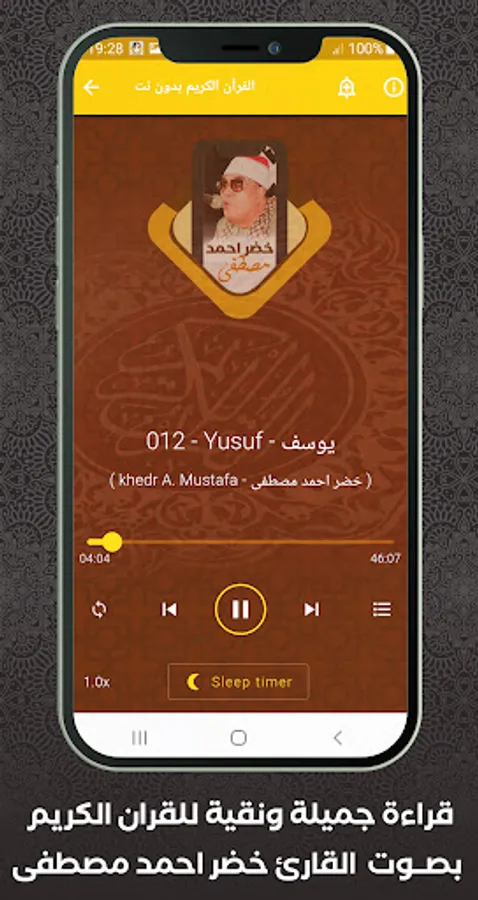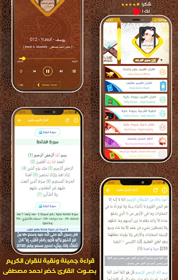 ⯌ The application is professionally designed, smooth and easy to access the content, and this is one of the best Islamic applications that helps you listen and read Quranic recitations without the Internet by Sheikh Khadr Ahmed Mustafa, so that you can enjoy them everywhere