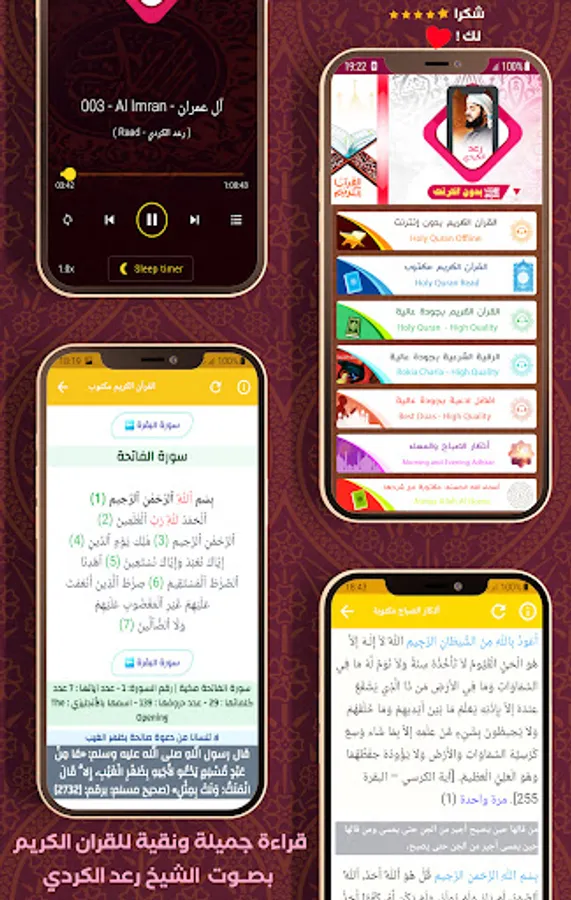 ⯈ This new application for the Holy Quran without the Internet provides access to the collection of exclusive Quran recitations, supplications, recitation morning and evening remembrances, with the voice of Sheikh Raad Mohammad al Kurdi .