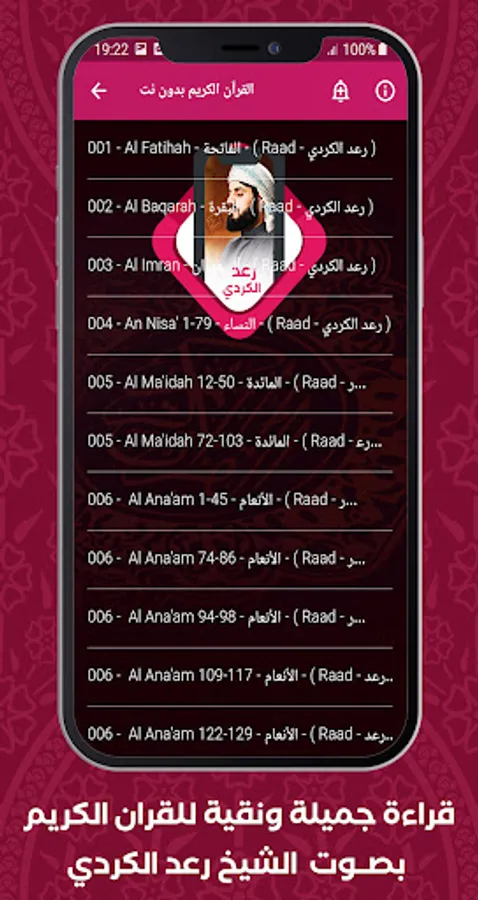 ⯈ You can use this application with ease and also read and listen to the surahs of the Noble Qur’an, enjoying the voice of the reciter Raad Al-Kurdi , who is one of the most famous reciters