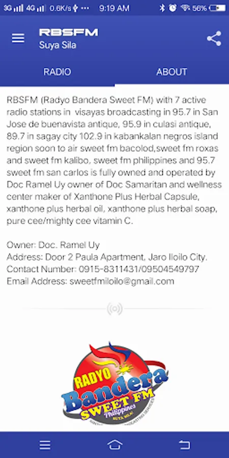 RBSFM (Radyo Bandera Sweet FM) with 4 active radio stations in visayas broadcasting in 95.7 in San Jose de buenavista antique, 95.9 in culasi antique, 89.7 in sagay city 102.9 in kabankalan negros island region, sweet fm bacolod, sweet fm roxas and sweet fm kalibo, sweet FM San Carlos 95.7 & sweet fm philippines is fully owned and operated by Doc Ramel Uy owner of Doc Samaritan and wellness center maker of Xanthone Plus Herbal Capsule, xanthone plus herbal oil, xanthone plus herbal soap, pure cee/mighty cee vitamin C.