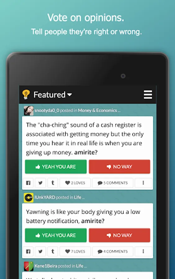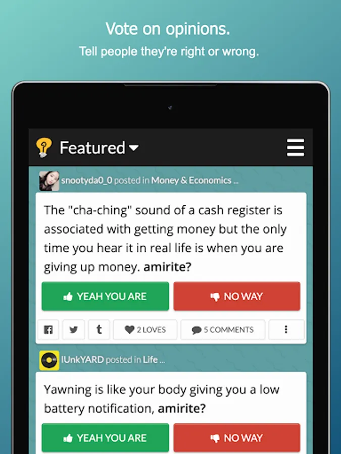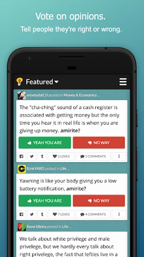 Post an opinion and people will vote if you are right or not. Amirite is the best place to discuss anything and everything including everyday life, growing up, tv, movies, and politics.
