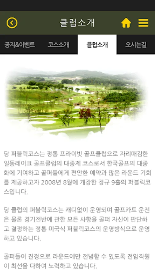 당 퍼블릭코스는 정통 프라이빗 골프클럽으로 자리매김한 락가든골프클럽의 대중제 코스로서 한국골프의 대중화에 기여하고 골퍼들에게 편안한 예약과 많은 라운드 기회를 제공하고자 2008년 8월에 개장한 정규 9홀의 퍼블릭코스입니다.