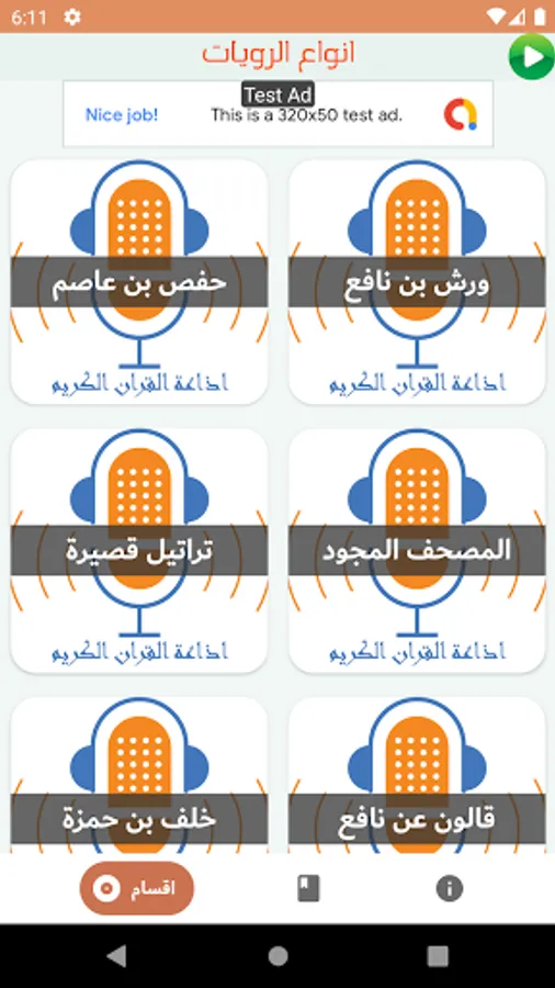 An application that is a direct radio broadcast of the Holy Qur’an that contains several narrations, including the narration of Hafs on the authority of Asim, workshops on the authority of Nafi’, and Qalun on the authority of Nafi, and the Qur’an on the authority of Mujawd and Khalaf on the authority of Hamza and Ibn Dhakwan on the authority of Ibn Amer and others