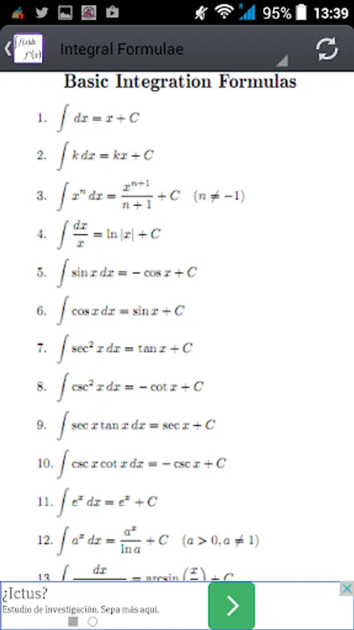 In this app you will enjoy a table of derivative formulas and another collection of integral formulas. With it we hope to help you with your calculus in your studies of maths.
