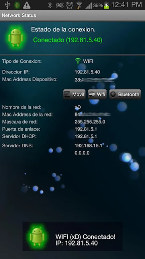 Network Status is an application that reports the status of the network connection or MOBIL WIFI, Display the details of the connection established. Lets share the connection information. Buttons enables quick access to system settings.