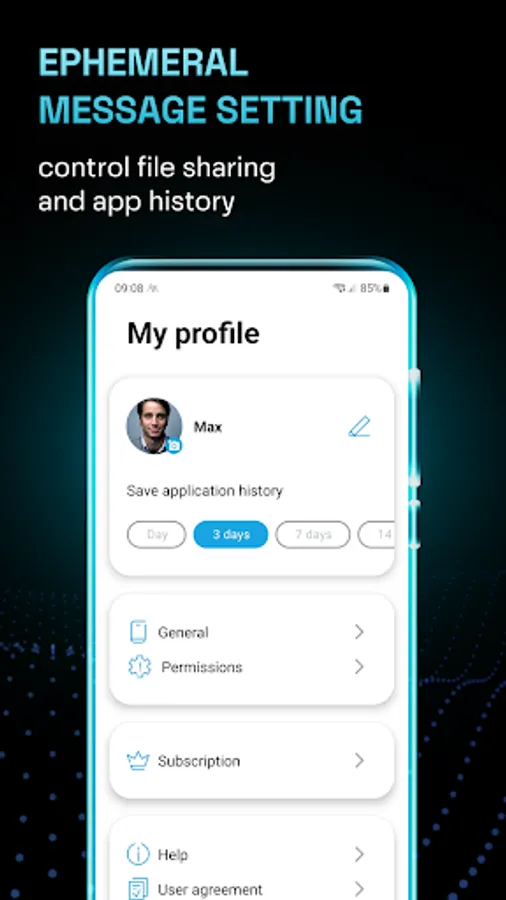 All messages and files are automatically deleted from the device after specified amount of time. It is 14 days by default. You can set up auto-delete time for 1, 3, and 7 days. Metadata is deleted along with messages and files.