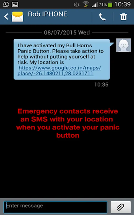 - your emergency contacts will receive an SMS notification with your actual location which is updated every 30 seconds. So you can get help, even if you can't speak or are on the move.