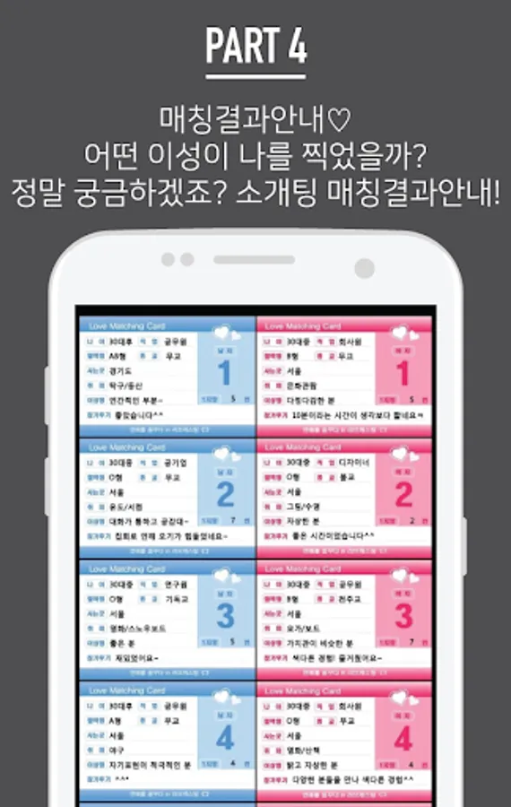 진솔한 대화를 나눠보며 최종 3지망 매칭을 통해 호감가는 이성분을 직접 선택하는 주말 오프라인 소개팅 어플 입니다