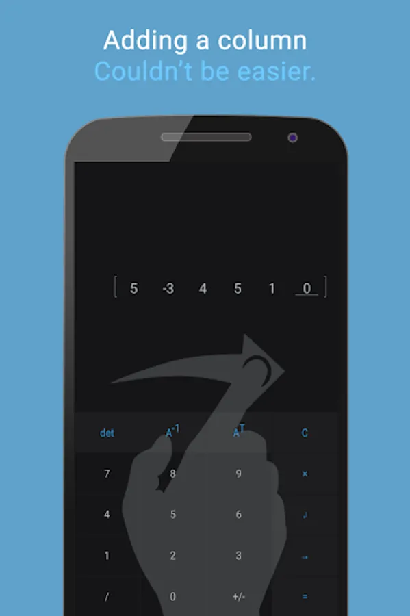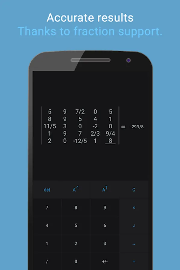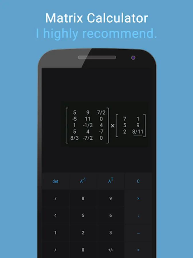 The most handy and user-friendly Matrix Calculator available on the store. It lets you perform matrix operations just like average calculators on numbers. Much better than other graphic calculators and matrix solvers. Create a matrix just by swiping across the screen in order to add a row or column. Supports fractions (1/3 instead of 0.33333) for more accurate results.