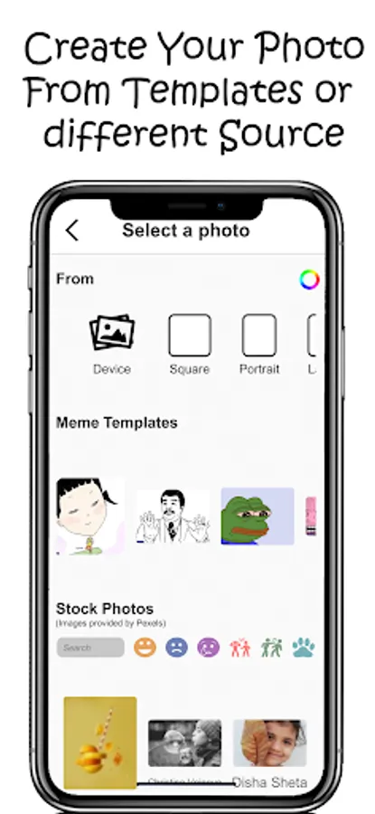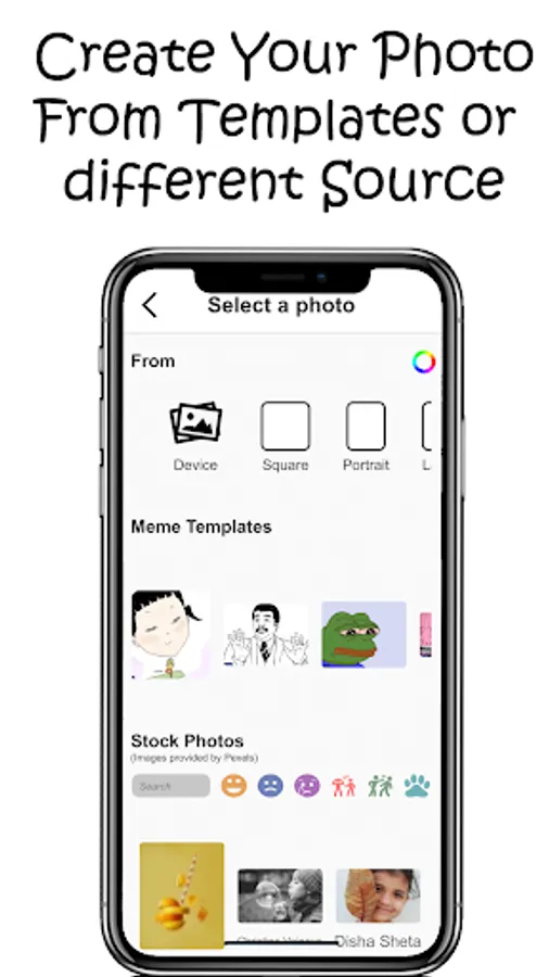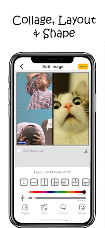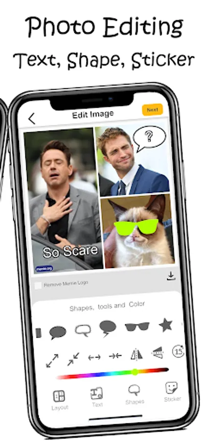 Create your own meme images with online templates uploaded by other users. You can edit from the template, add texts, shapes and sticker, apply filter and collages.