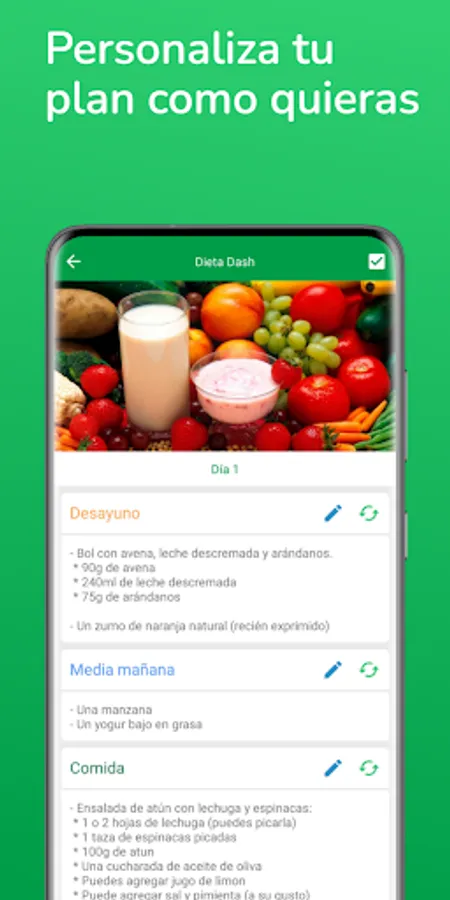 This app will create a diet and food plan for 30 days but if you don't like this food plan you can always edit it to your liking. Upon entering each day you will find two buttons at each meal time. These buttons will help you modify your diet plan so that you are happy with the food.