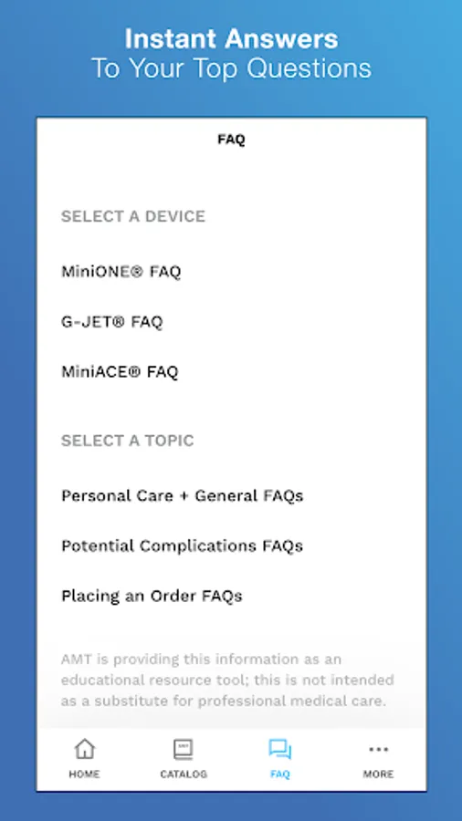 - Quick Care™: Easily explore and learn about AMT’s devices with FAQs and How-To Videos.
