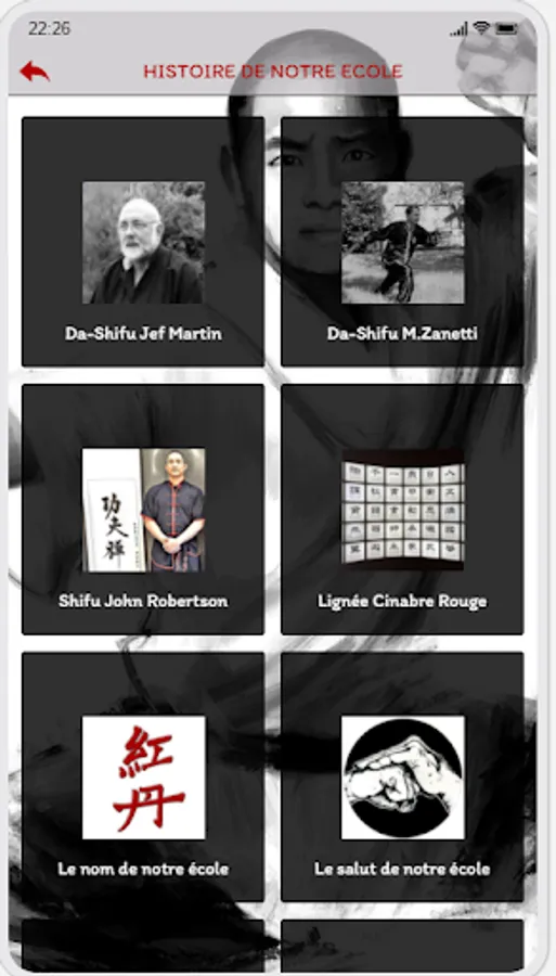 In this application, you will find all the information relating to the Ecole du Cinnabre Rouge, Chinese martial arts school, created by the late Da-Shifu Jef Martin in 1982 in Cysoing (North).