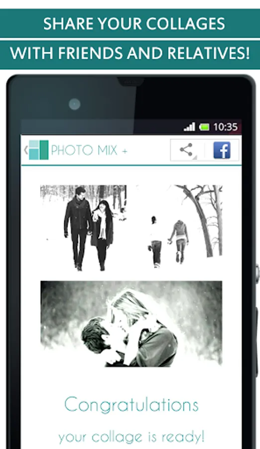 With Photo Mix + you can create collages from your favourite photos. Holiday memories, birthday parties, hangouts with friends or any other important moment of your life can be saved in a form of a colorful collage. The final effect can be shared easily with your firends on your Facebook account!