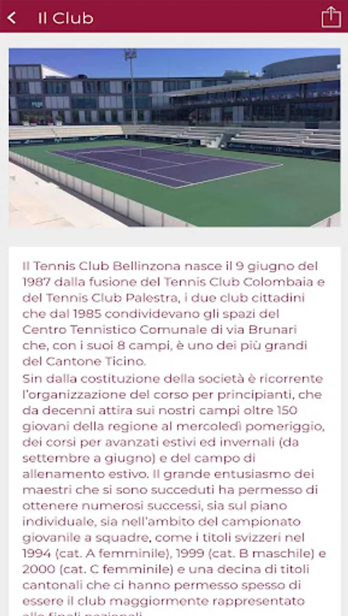 The Bellinzona Tennis Club was born on 9 June 1987 from the merger of the Colombaia Tennis Club and the Palestra Tennis Club, the two city clubs that since 1985 shared the spaces of the Municipal Tennis Center in via Brunari which, with its 8 courts, is one of the largest in the Canton of Ticino.
