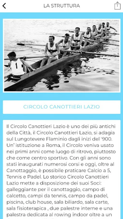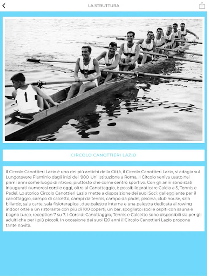 The Circolo Canottieri Lazio is one of the oldest in the city, the Circolo Canottieri Lazio, has been lying on the Lungotevere Flaminio since the early 1900s. An institution in Rome, the club was used in the early years as a meeting place rather than as a sports center. Over the years, numerous courses have been inaugurated and today, in addition to rowing, it is possible to practice 5-a-side football, tennis and padel. The historic Circolo Canottieri Lazio offers its Members: rowing float, soccer field, tennis courts, padel court, swimming pool, clubhouse, billiard room, card room, physiotherapy room, two internal gyms and a dedicated gym indoor rowing as well as a restaurant with more than 100 seats, a bar, changing rooms for members and guests with sauna and turkish bath, reception 7 out of 7. The Rowing, Tennis and Five-a-side Courses are available for both adults and children . On the occasion of its 120th anniversary, the Lazio Rowing Club offers many new features.