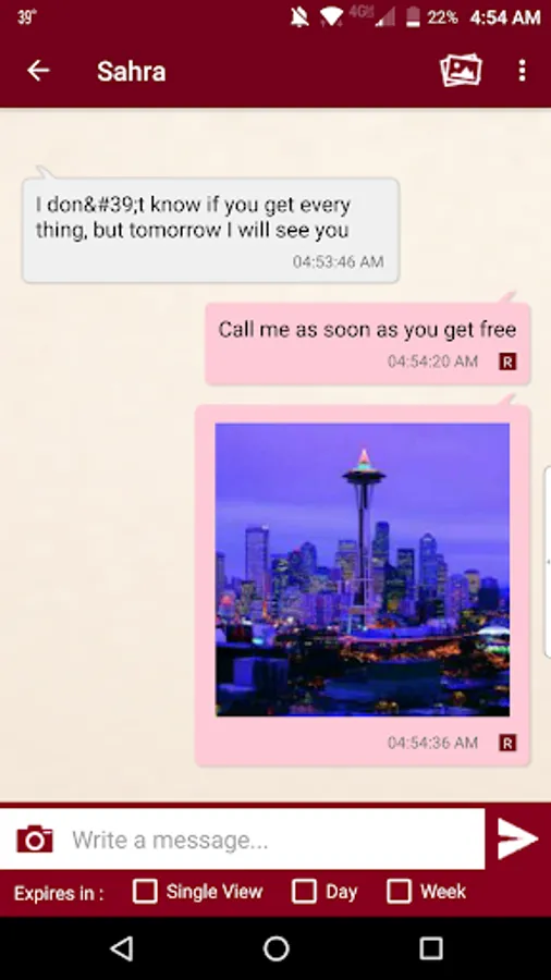 You can manage the privacy of every message you want to send, you can decide how long the other part can keep your message, include (one time view, 24 hours, 1 week, 1 month or forever).
