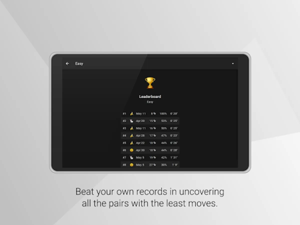 Keep track of how quick you uncover all the pairs and beat your own records! The leaderboard captures your top 10 records of all time.