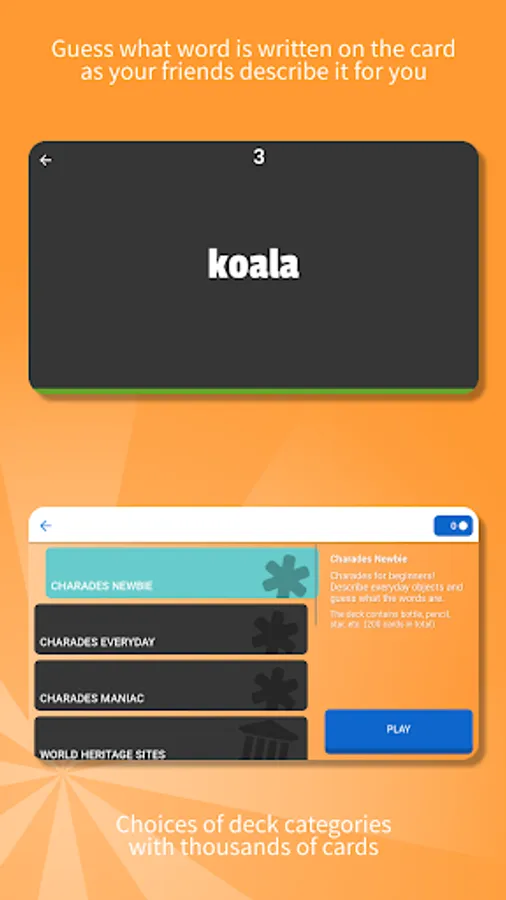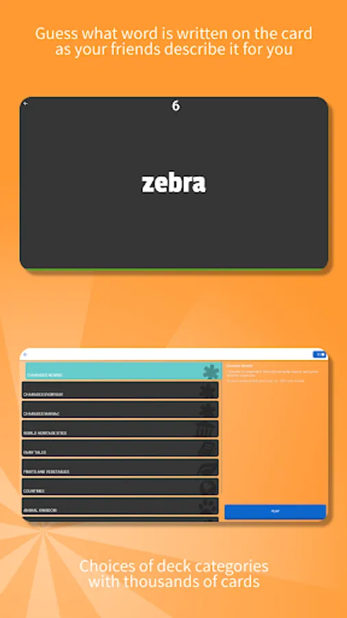 Fun casual game for small party and get-together. Team up with one of your friend, and guess as many words as possible in charades - heads up game! Pick a deck of cards from animals, foods, landmarks, and more. Thousands of words to keep you entertained, with additional word packages available for purchase.