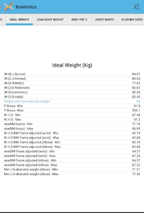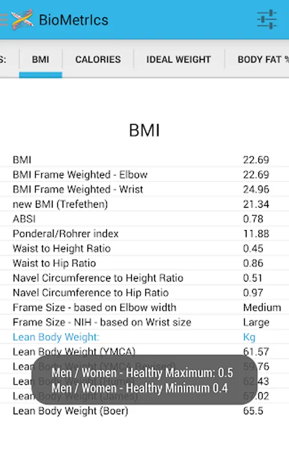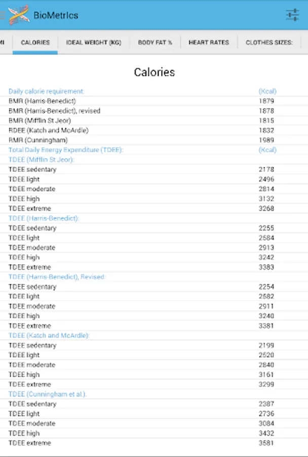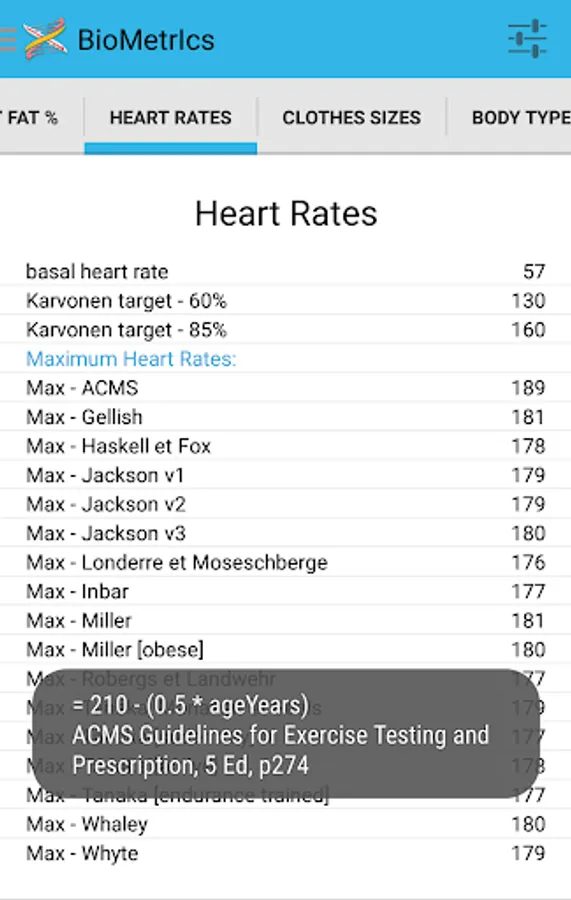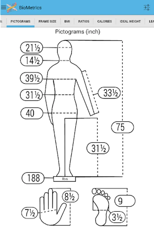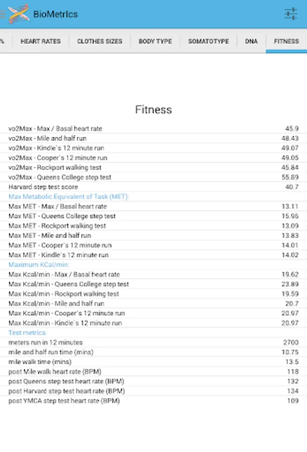 Ever needed to know your hat size, guestimated body fat or current fitness level? If you have then this app aims to provide a handy store for your vital statistics (circumferences, tailor measures, DNA, blood content, heart rate, BIA data, etc), along with offering a one stop shop for the common formulaic derived biometrics you may occasionally require, wish to contrast with another formulation of the same metric, discount, share or learn something about. Such as your: Japanese shoe size, glove size, BMI, newBMI, ABSI, BAI, Ponderal Index, a plethora of estimated daily calorie requirements (BMR / RMR / BEE / ERR / TDEE), Body Surface Area (BSA), international clothes sizes, target training and maximum heart rates, ideal weight, body composition, body fat and lean mass (LBW), waist to hip and height (WHtR) ratios, somatotype (Heath-Carter and Rempel) classifications, body type, body shape, body density (BD), heart rate derived fitness estimates (VO2, VO2Max, MET / vVO2Max), body water (TBW / ICW), lung capacities (FVC / FEV1 / FEV1% / FRC / RV / TLC / DLCO), DNA derived haplogroup (common ancestor) predictions, estimated blood and breath alcohol levels, from consuming a single unit, estimated step length and more.