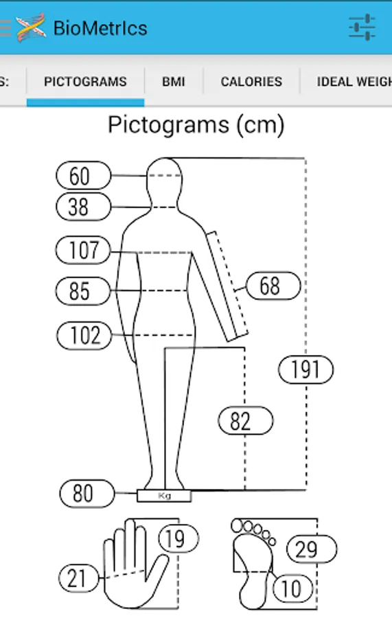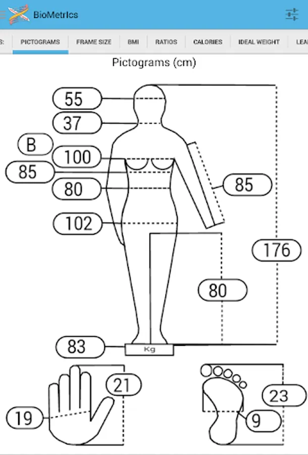 You have the ability to compare your vitals in Metric and Imperial measures, on a EN 13402 pictogram, graph and track changes to your vitals and the associated derived metrics, share your data (measurements) or simply a knowledge of one of the derived metrics. The app will attempt to detail the originator, formula and vitals used to calculate each result.