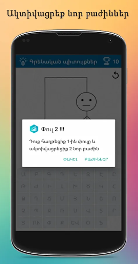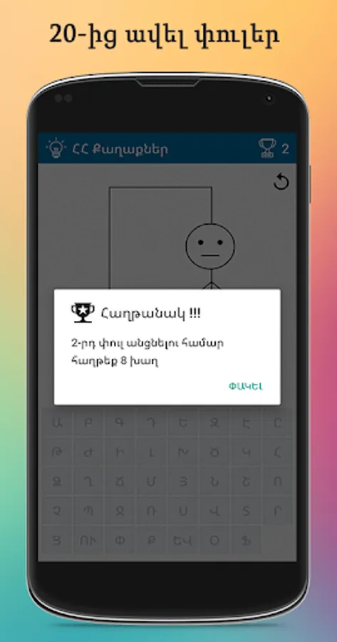 ArmHang-ը հիմնված է դասական «Hangman» խաղի վրա: Խաղում անհրաժեշտ է կռահել նշված բաժինների բառերը: Խաղում դուք ունեք ընդամենը 6 սխալի հնարավորություն:
