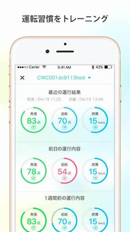 ・アプリ内「履歴」タブでは、取得した1走行毎の点数および燃費を表示します。