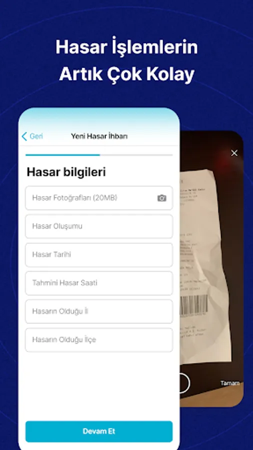 - You can view your motor insurance or traffic policy details related to your vehicle insurance, track the status of all your damage files and notify about the repaired damages, as well as request mini repair/towing services.