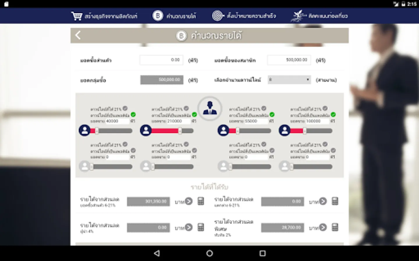 Income Simulator on iPad is the system to provide understanding for Amway prospects by creating an information model based on the real calculation process regarding to Amway policy. To avoid the confusion of prospects and new ABOs in running the business due to the detailed rules in Amway Business Plan, we have created the Income Simulator to facilitate prospects and new ABOs with simply basic and easy access to the complete information comprising 4 functions below:.
