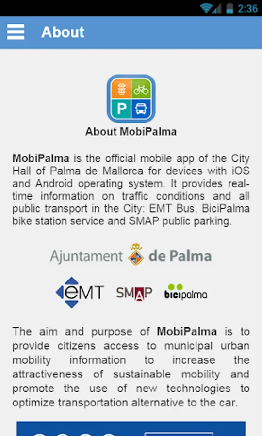 * [General] Be informed of any incident in public roads and in the transport network, regardless of the sender: Town Hall, EMT Palma or SMAP. Notices on important incidents are sent as an automatic notification to your phone, and you can always disable it in the Settings screen.