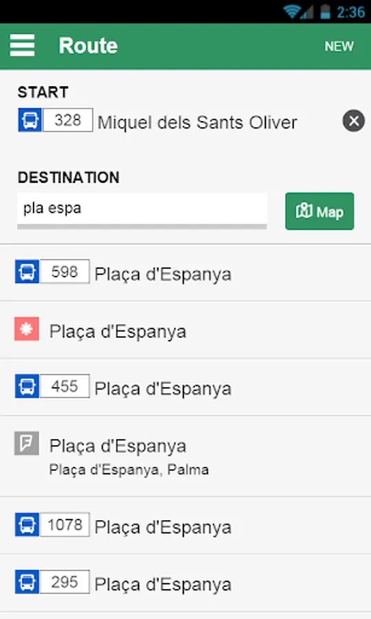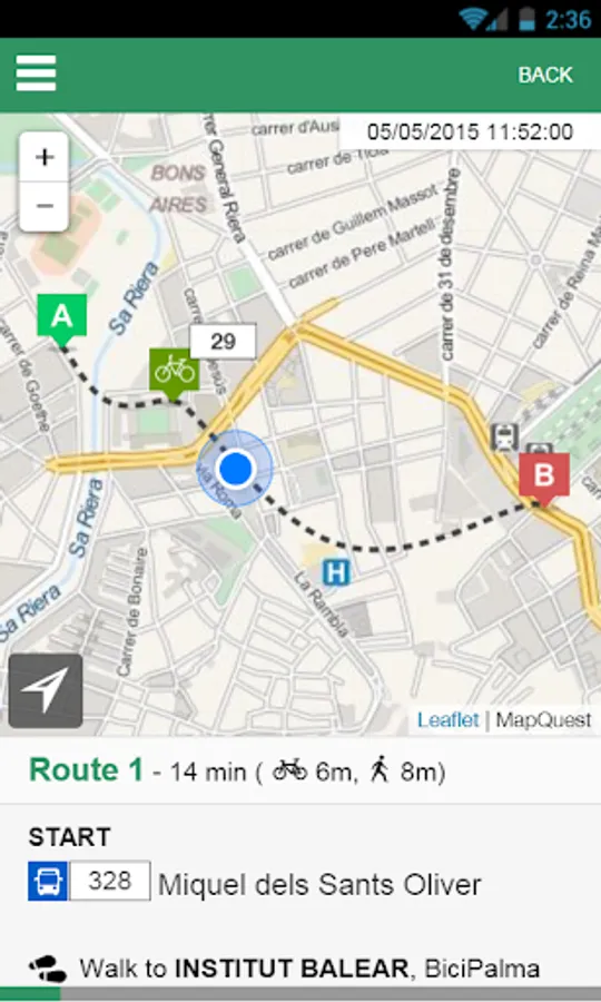 * [Routes] Calculate routes between a source and a destination using the bus network or using different combinations of bus, public bike and parkings. You can set the source and destination of the route by searching for street names or places: a hotel, a restaurant, a bar, a shop or a mall... And of course, you can select any point directly on a map of the city that shows your location.