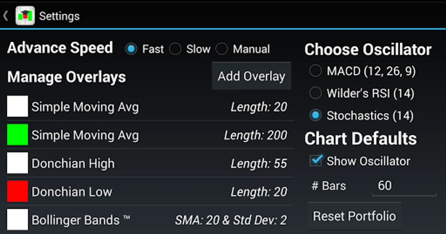 You choose and customize your own technical indicators (Simple Moving Average, Exponential Moving Average, Donchian High/Low, and Bollinger Bands) and choose an oscillator (RSI, Stochastics, MACD)