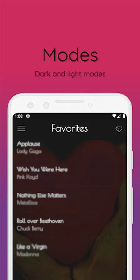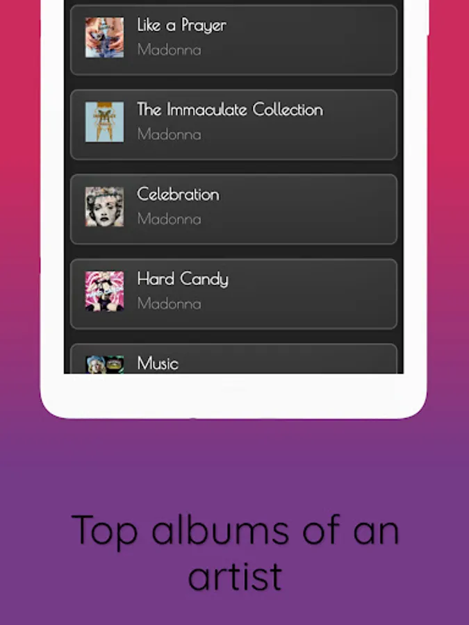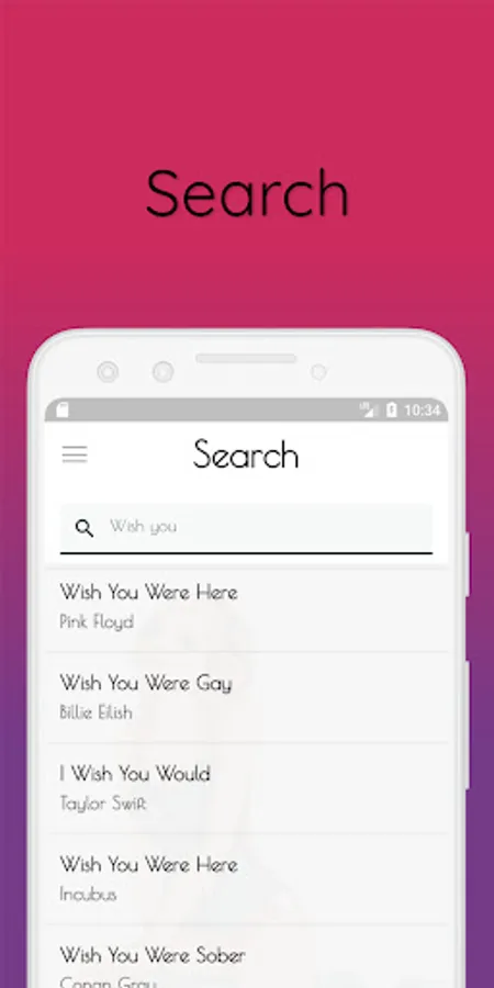 Free lyrics searcher and album cover images of your favorite artists. Can generate a list of favorites to read songs offline.