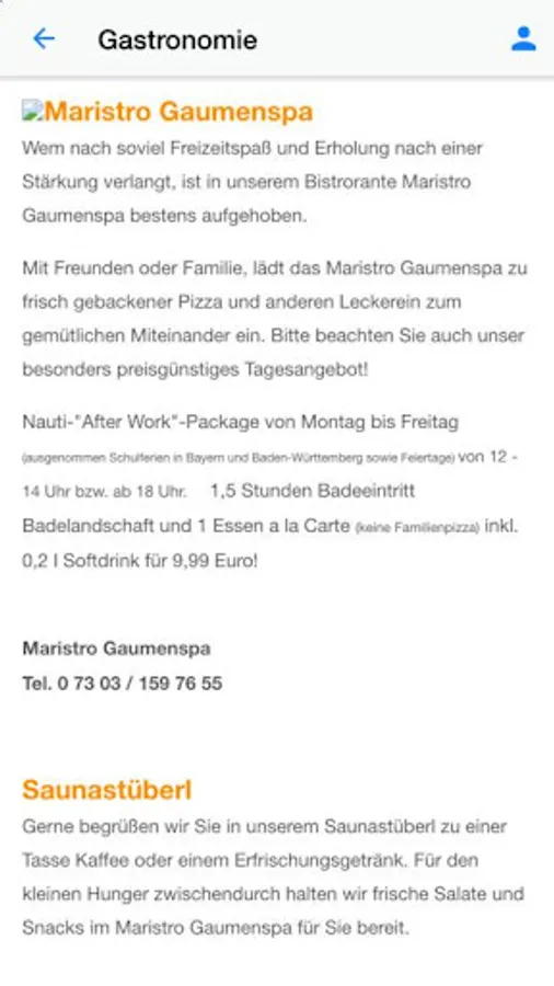 With our Virtual Tour, you can already see in the run-up to the pool and sauna landscape. Our Aqua classes are clearly listed with dates in the app. You want to celebrate a child's birthday or reserve a table in our restaurant sector?