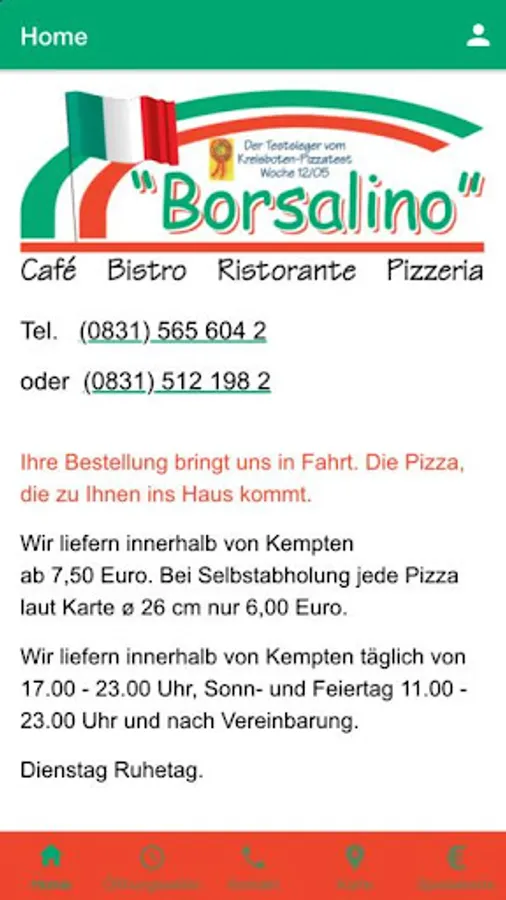 We deliver within Kempten daily 17:00 to 23:00 on Sundays and holidays 11:00 to 23:00 and by appointment.