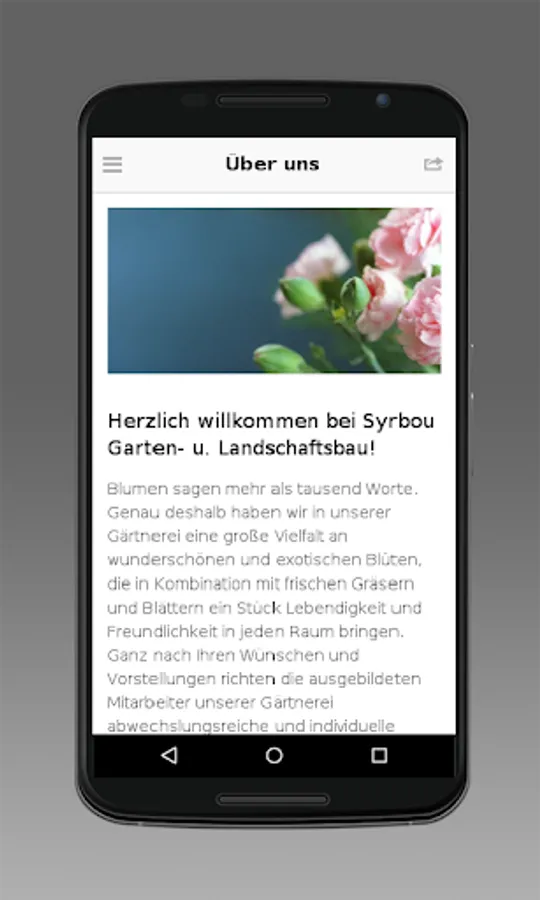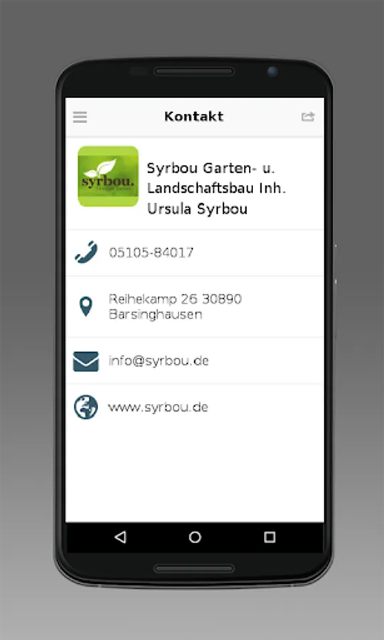 Holen Sie sich unsere offizielle Syrbou Gartenbau-App! Informieren Sie sich mobil über unser Unternehmen und stehen Sie immer in direktem Kontakt zu uns. Sie sind mobil - und wir sind es ab sofort für Sie auch!