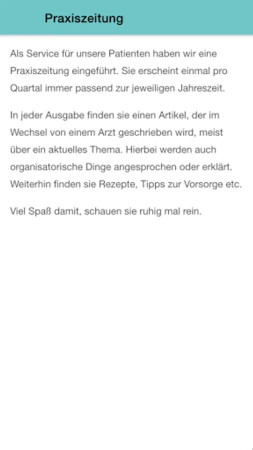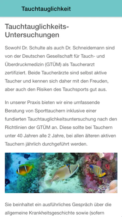 Find everything worth knowing and useful to your family doctor-internist group practice in Karlsruhe Durlach here. Drs. Pietz, Schneidemann, Schulte, Zimmermann, Hübner and Stross offer an insight into their understanding of a patient-practitioner medicine. In the app, you have the option of prescriptions and referrals to order. There are also valuable explanations for fitness before diving.