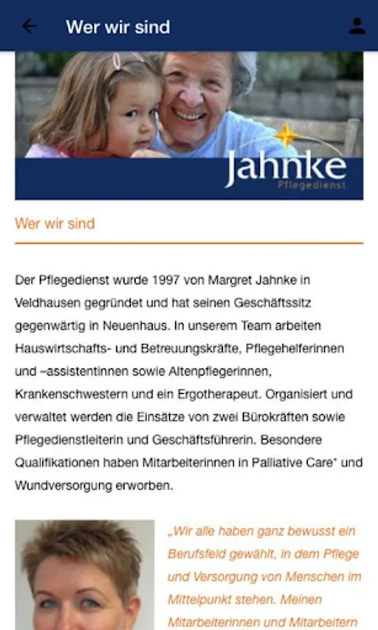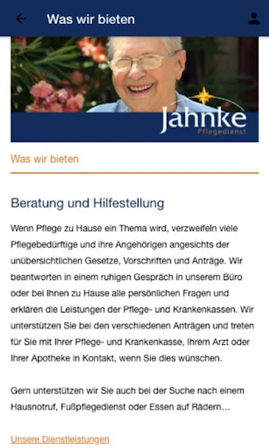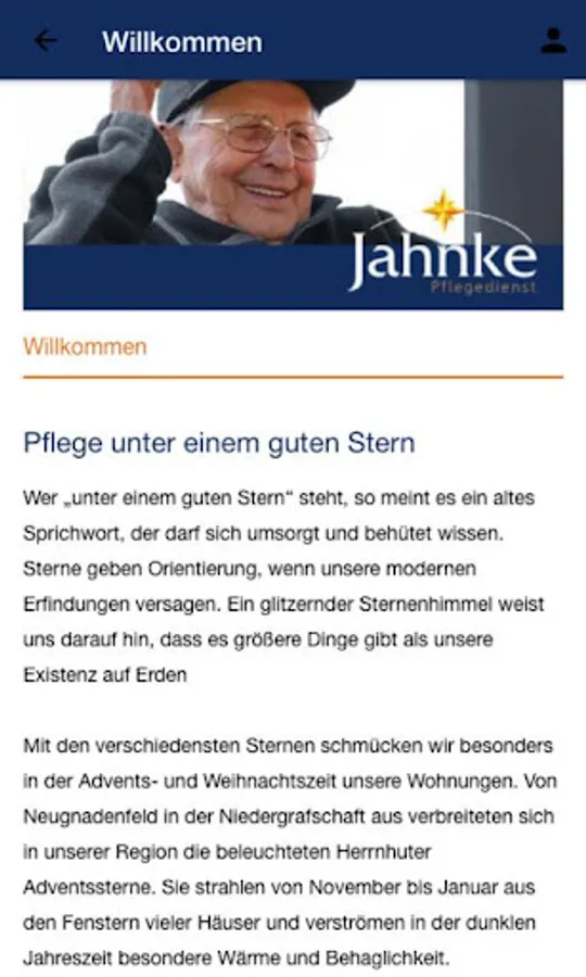 Welcome to the official app of Jahnke Nursing from Neuenhaus. Our clients and patients should learn from us "care under a lucky star" and feel well cared for in our care. Inform yourself in the app about our services and care options.