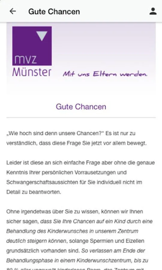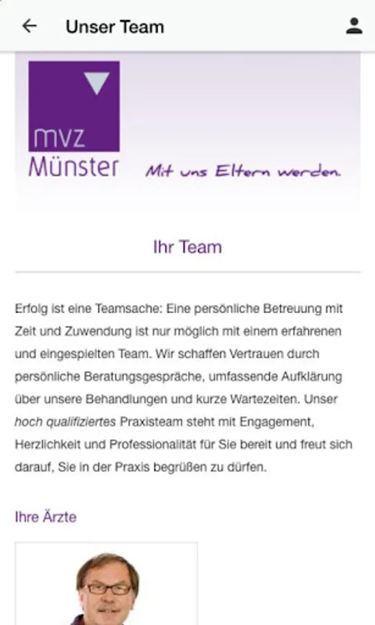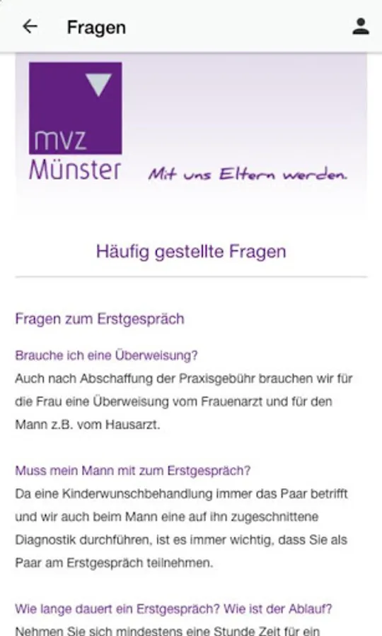 Welcome to the app from the fertility clinic Münster! We can offer our certified according to DIN standards practice tailored to you, personal treatment at the highest scientific level. Inform yourself in the app about our treatment, our team and the cost.