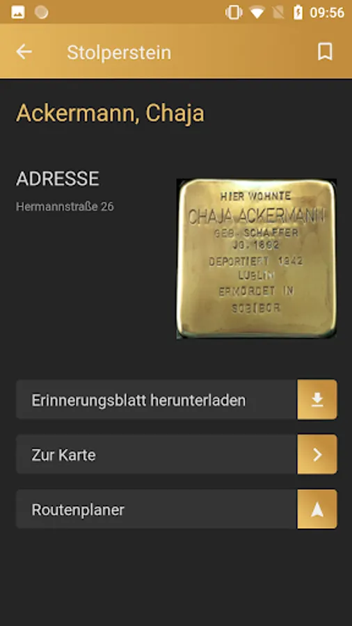 To give especially young people more interested in the victims of the Nazi period, we had to create the idea of an app for stumbling blocks. If you walk through the city, they encounter a repeatedly: the gold pieces fall directly into the eye. We all see this monument stones a wonderful idea, but on the stone itself only a few details are available, and precisely at this point is to help our app. To obtain more information in the form of the memory sheet of the stones, the user only needs to open and already it determined by GPS or the stumbling blocks that are its position closest to our app - one click and the memory sheet appears. Of course, the app is also useful for targeted searches stumbling blocks.