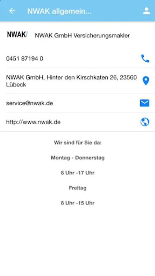 The NWAK GMBH is a joint venture of the insurance Kontor MARTENS & PRAHL Lübeck and powerful insurers. This app gives you direct access to your valve broker. They are mobile - and we are now available to you too! Just download for free and get started!