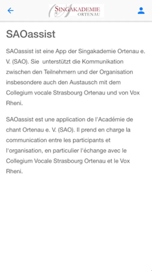 The APP SAOassist supports communication between the organization Singakademie Ortenau, Collegium Vocale Strasbourg Ortenau, Philharmonic Choir Baden-Baden and your members / participants in the project. It is made available to members / participants in the project for free. It includes information about the events, samples, sample content, etc.