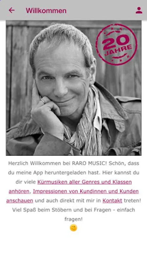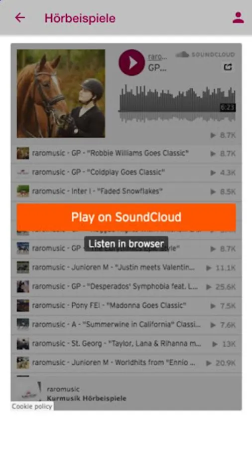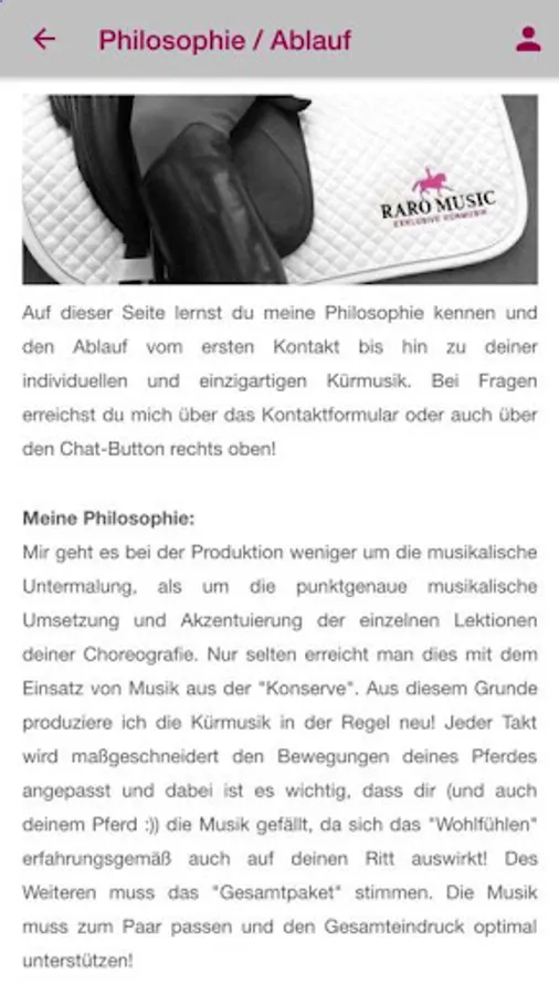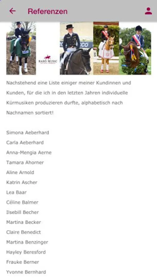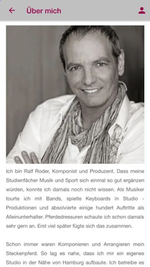 I'm Ralf Roder, composer and producer of Kürmusiken for dressage riders. With this app, I want to introduce myself to you and inform you about my philosophy and way of working. Furthermore, you can listen to many Clips of every genre and every class, watch impressions of customers and also contact me directly!